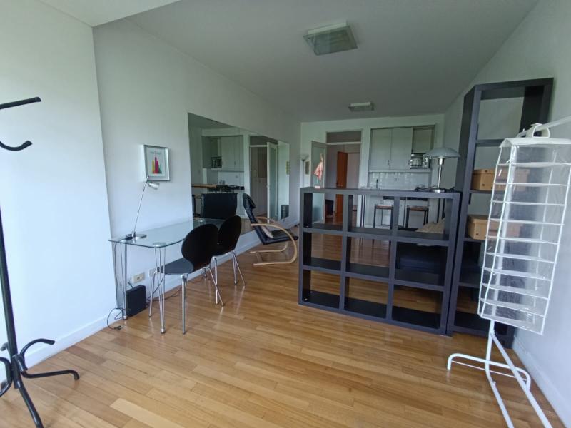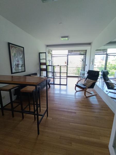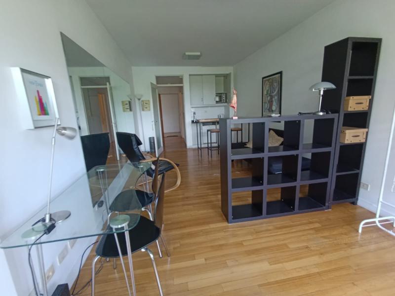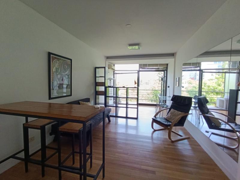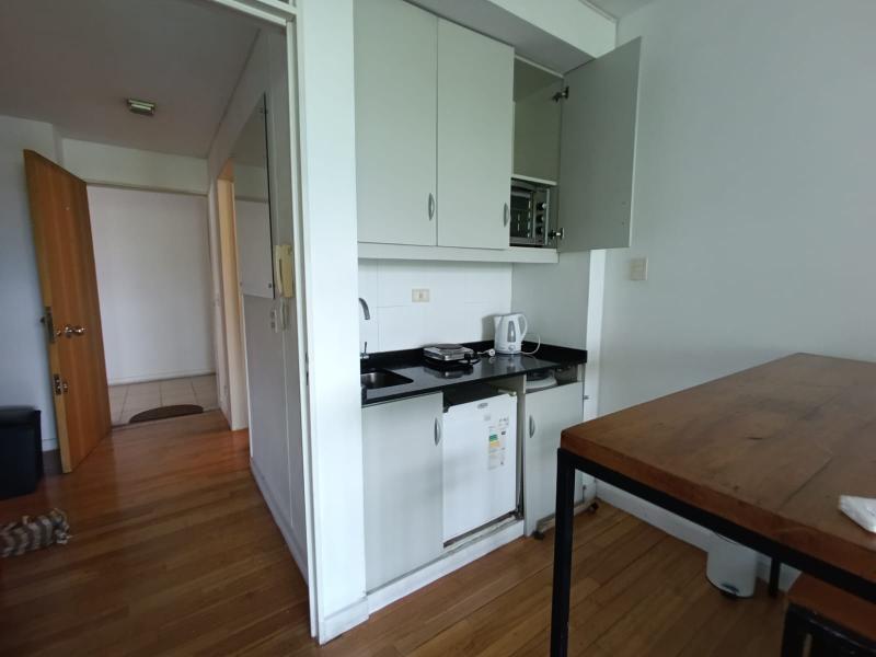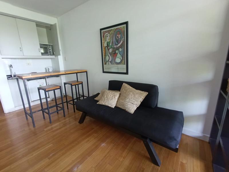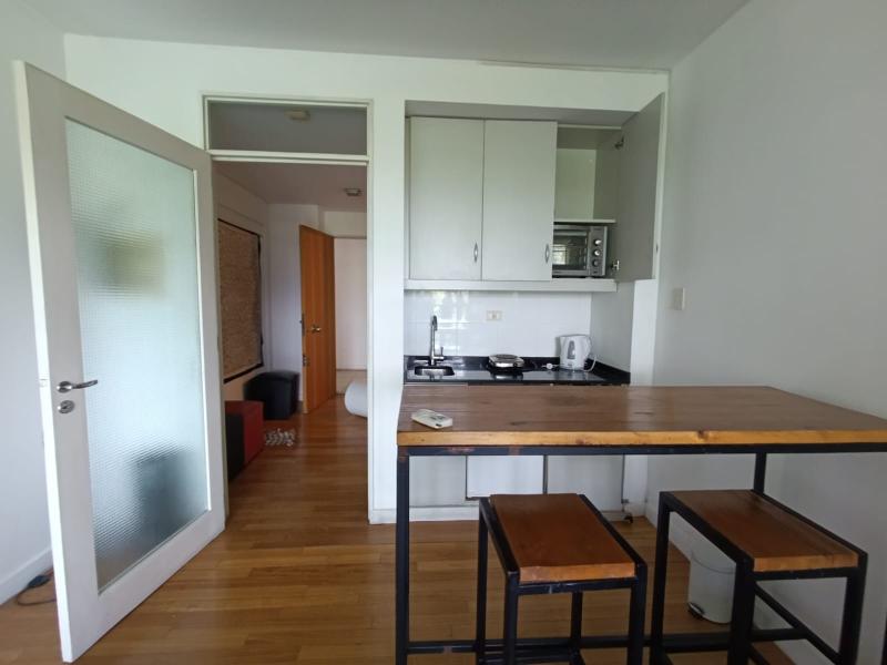 Comodidades: El departamento cuenta con recepción que se puede acondicionar para escritorio con puerta , baño completo con bañera, ambiente con cocina integrada con heladera frigobar, termotanque, horno eléctrico, alacenas, mesa tipo barra, aire acondicionado, mueble divisor, sillón cama de una plaza. Piso de parquet