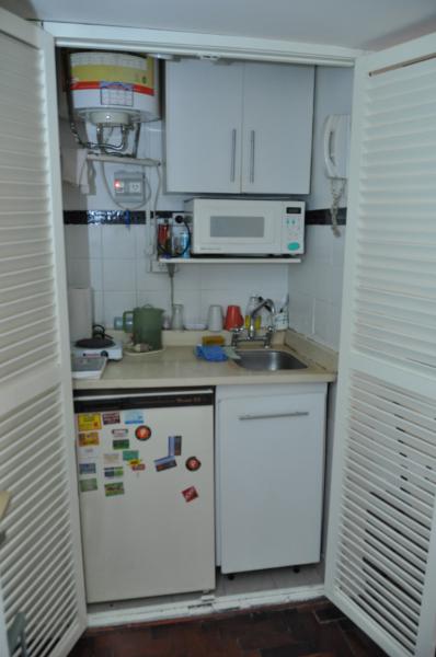 Comodidades: Está equipado para 2 personas con dos camas twin, mesas, sillas, kitchinette con nafe eléctrica, horno microhondas, pava eléctrica, heladera bajomesada, vajilla y utensilios necesarios. Agua caliente con termotanque eléctrico. Aire acondicionado y calefacción también eléctrica. El baño es muy amplio, incluso con ventana al exterior, y luz natural