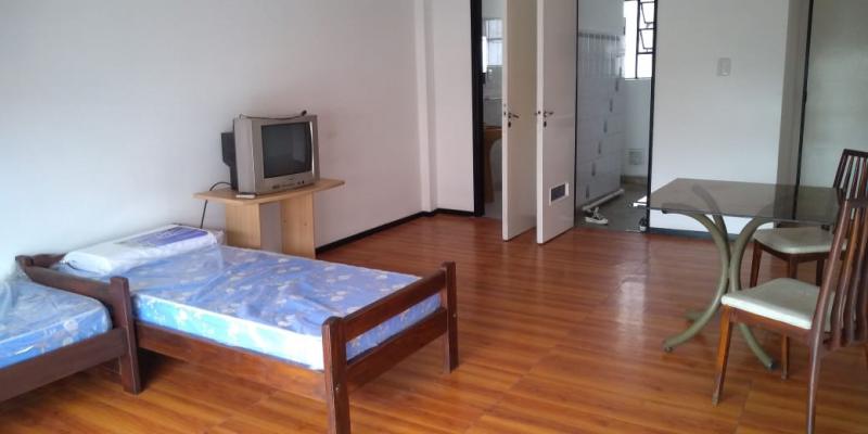 Comodidades: El monoambiente posee dos camas individuales con almohadas y colchon, TV, mesa de vidrio para comer sillas, heladera con cocina con horno vajilla basica y utensillos basicos. Heladera se comprara a pedido de inquilino.